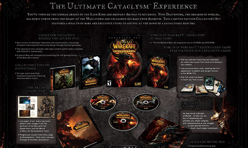 Před malou chvílí byla představena Sběratelská edice připravovaného datadisku Cataclysm. Edice se bude podobat té u WotLK, takže na vás potěší obsáhlá kniha plná Artů, super podložka s Deathwingem a mnohem více. Podrobnější informace najdete níže.